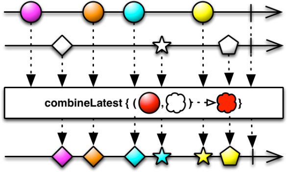 마블 다이어 그램을 보면 첫번째 Observable에서 핑그색이 들어 왔지만 아직 2번 Observable에서 데이터가 들어오지 않아 값이 없습니다. 하지만 마름모가 들어오면서 핑크 마름모가 나타나고 주황색이 들어오면서 주황색 마름모를 볼 수 있습니다.